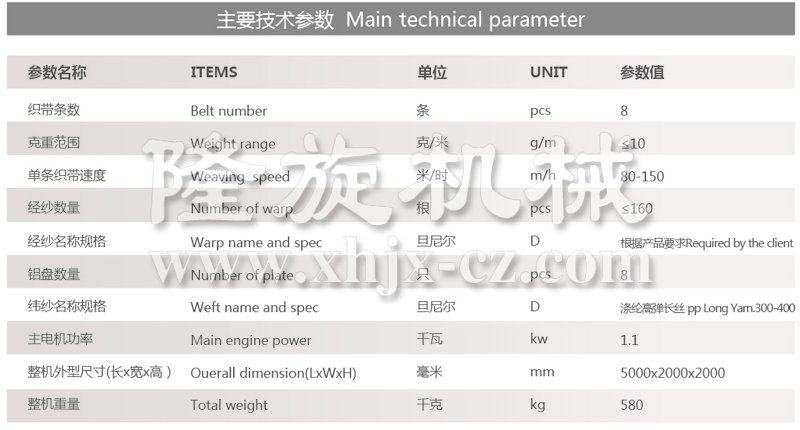 產(chǎn)品概述:XH8-30型防漏條編織機(jī)主要用于編織集裝袋用防漏條、鞋帶、提包帶等。并根據(jù)防漏條的特點(diǎn)設(shè)計(jì)了專(zhuān)用卷繞機(jī)。